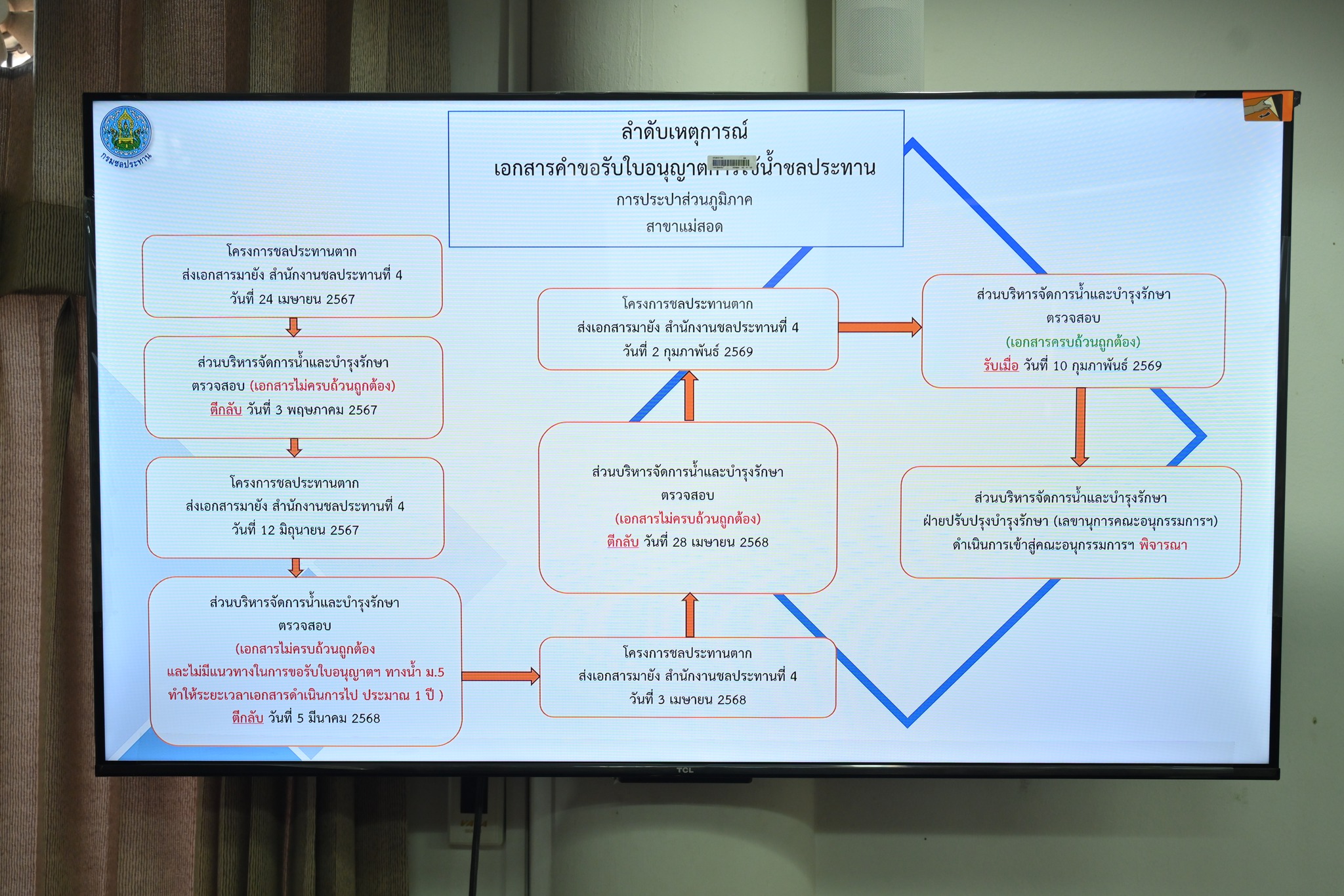 วันที่ 23 มีนาคม 2569 เวลา 09.00 น. นายปิยะ ลืออุติกุลวงศ์ ผู้อำนวยการสำนักงานชลประทานที่ 4 แล้วเจ้าหน้าที่ผู้เกี่ยวข้อง เข้าร่วมประชุมการดำเนินการเกี่ยวกับการใช้น้ำจากทางน้ำชลประทาน ครั้งที่ 2/2569 ณ ห้องประชุมนาคา สำนักงานชลประทานที่ 4 เพื่อรับทราบผลการดำเนินการเกี่ยวกับการใช้น้ำจากทางน้ำชลประทาน มีจำนวน 1 ราย ได้แก่ การประปาส่วนภูมิภาค สาขาแม่สอด เพื่อให้การพิจารณาเพื่อให้เป็นไปตามหลักเกณฑ์ วิธีการ และแนวทางปฏิบัติในการขออนุญาตการใช้น้ำฯ อย่างถูกต้องตามกฎระเบียบที่กำหนดไว้
