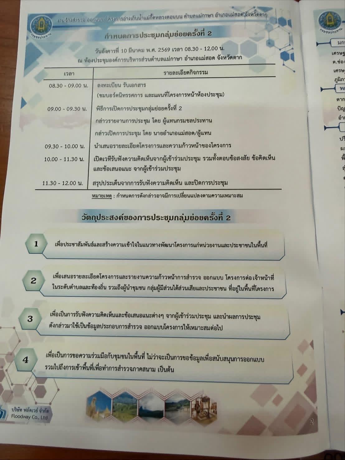 วันที่ 10 มีนาคม 2569 เวลา 09.00 น. นายปิยะ ลืออุติกุลวงศ์ ผู้อำนวยการสำนักงานชลประทานที่ 4 มอบหมายให้ส่วนวิศวกรรม โดย นายสมฤทธิ์ สมสกุล หัวหน้าฝ่ายออกแบบ ร่วมประชุมกลุ่มย่อย ครั้งที่ 2 งานจ้างสำรวจ ออกแบบ โครงการอ่างเก็บน้ำแม่กึ๊ดหลวงตอนบน ตำบลแม่กาษา อำเภอแม่สอด จังหวัดตาก ณ ห้องประชุมองค์การบริหารส่วนตำบลแม่กาษา จังหวัดตาก โดยมีนายกันต์พงษ์ พิพัฒนมนตรีกุล นายอำเภอแม่สอด เป็นประธานในการประชุม เพื่อนำเสนอรายละเอียดความก้าวหน้าของโครงการ ให้กับหน่วยงานต่างๆ ประชาชน ผู้เกี่ยวข้องได้รับทราบ พร้อมรับฟังความคิดเห็นข้อเสนอแนะต่างๆ เพื่อให้การดำเนินงานของโครงการดังกล่าวเป็นไปอย่างมีประสิทธิภาพ และการพัฒนาแหล่งน้ำให้เกิดประโยชน์สูงสุด สอดคล้องความต้องการที่หลากหลายของประชนในพื้นที่