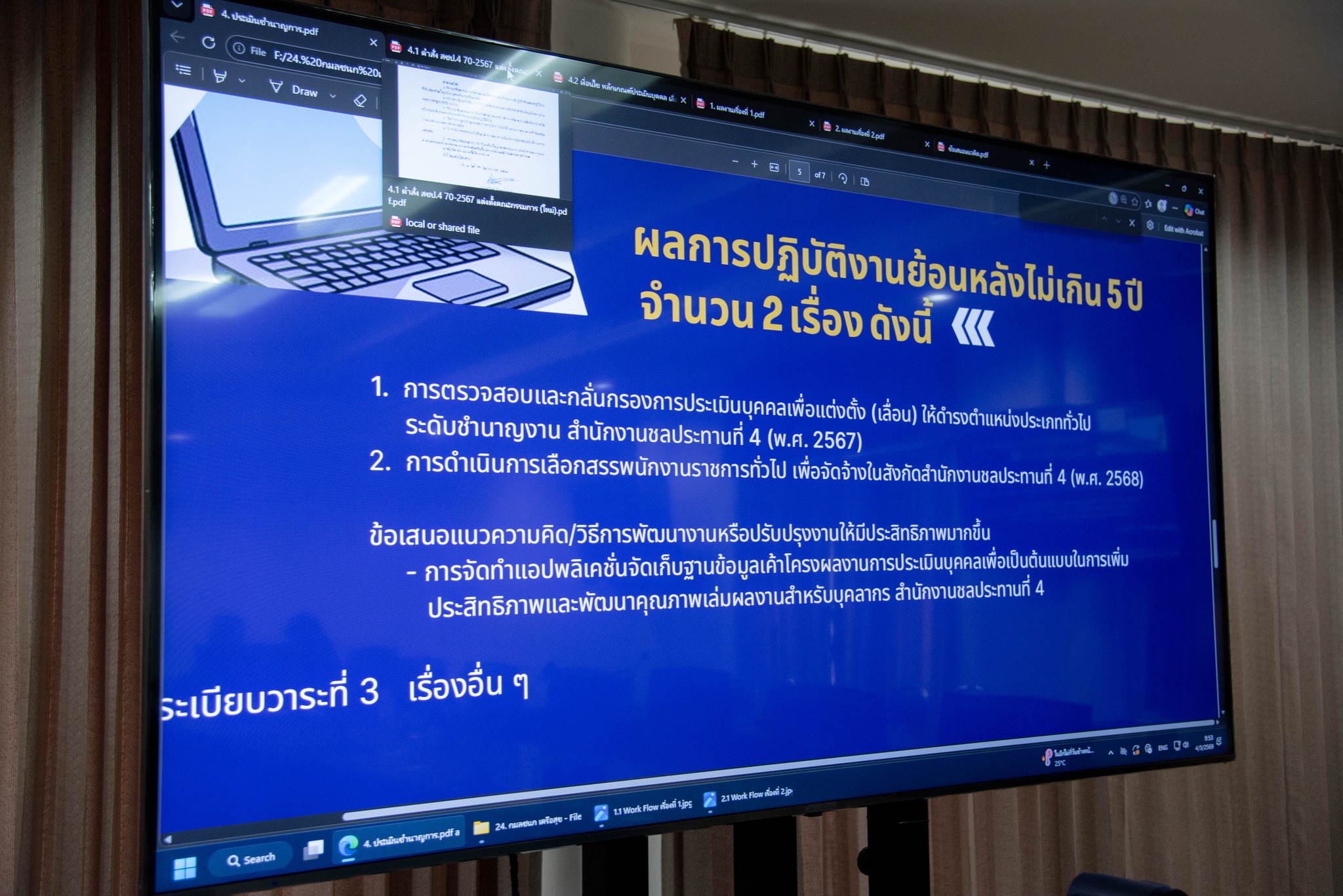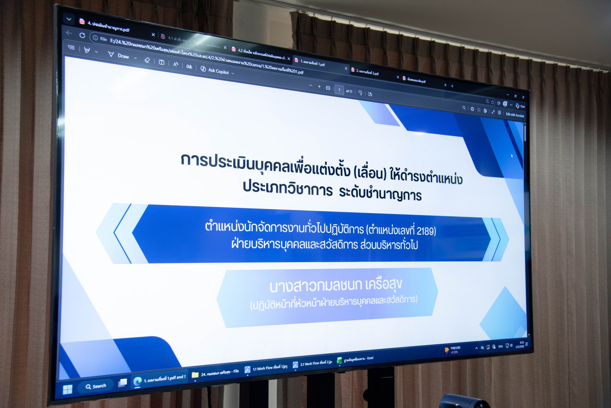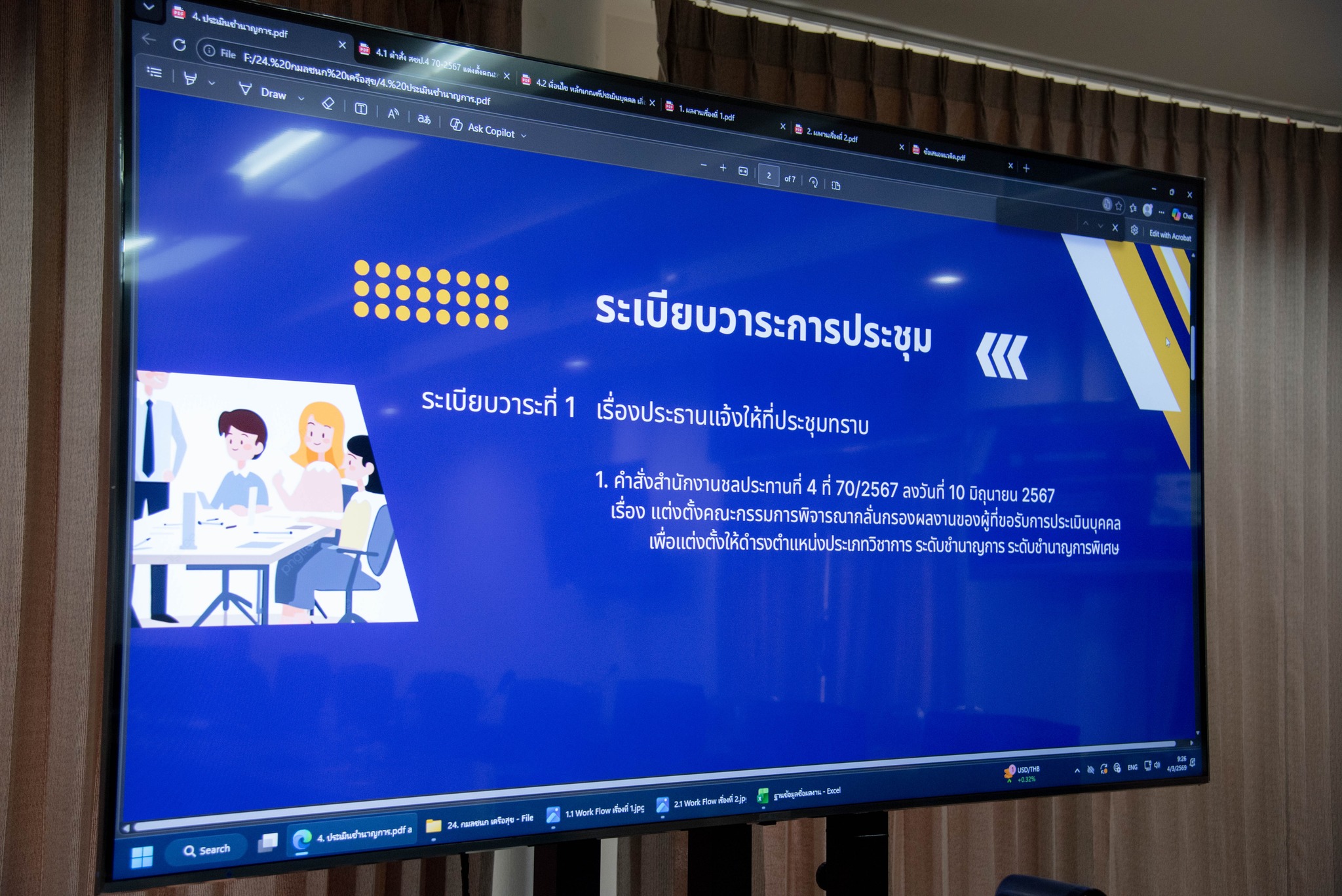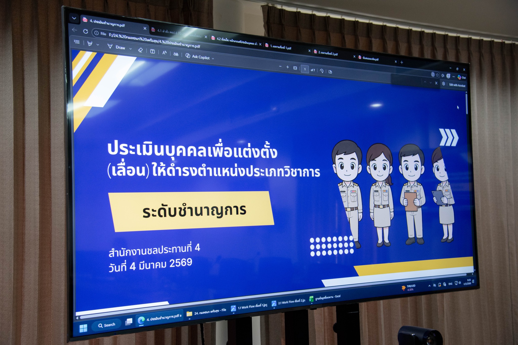 วันที่ 4 มีนาคม 2569 เวลา 09.00 น. นายบุญธรรม ปานเปี่ยมโภช รองผู้อำนวยการสำนักงานชลประทานที่ 4 และคณะกรรมการ เจ้าหน้าที่ผู้เกี่ยวข้อง เข้าร่วมพิจารณากลั่นกรองเอกสารประกอบการคัดเลือกบุคคลที่จะเข้ารับการประเมินผลงานเพื่อแต่งตั้ง (เลื่อน) ให้ดำรงตำแหน่งประเภทวิชาการ ระดับชำนาญการ ตำแหน่งนักจัดการงานทั่วไป ของนางสาวกมลชนก เครือสุข ตำแหน่งนักจัดการงานทั่วไปปฏิบัติการ (ตำแหน่งเลขที่ 2189) สังกัดฝ่ายบริหารบุคคลและสวัสดิการ ส่วนบริหารทั่วไป สำนักงานชลประทานที่ 4 ณ ห้องประชุมนาคา สำนักงานชลประทานที่ 4 เพื่อให้การพิจารณากลั่นกรองเอกสารประกอบการคัดเลือกบุคคลที่จะรับการประเมินผลงาน ที่ส่งประเมินผลงานเพื่อแต่งตั้ง (เลื่อน) ให้ดํารงตําแหน่งประเภทวิชาการ ระดับชำนาญการ เป็นไปตามระเบียบที่กรมชลประทานกำหนด