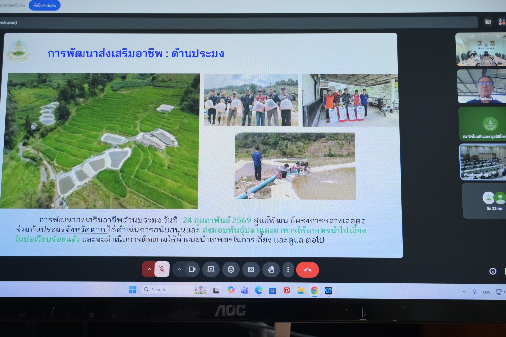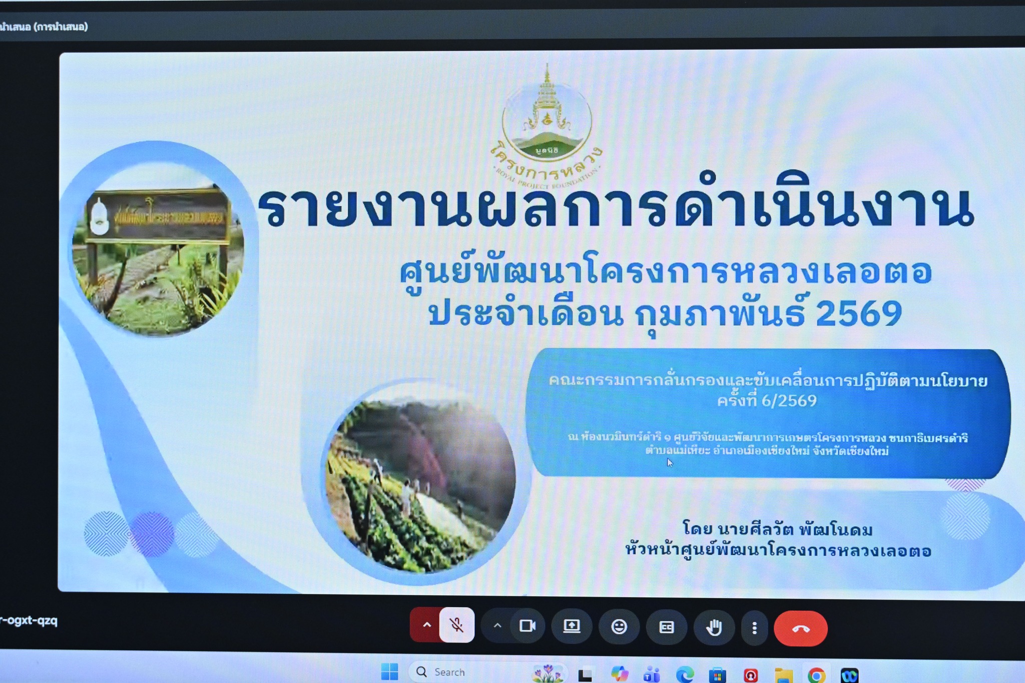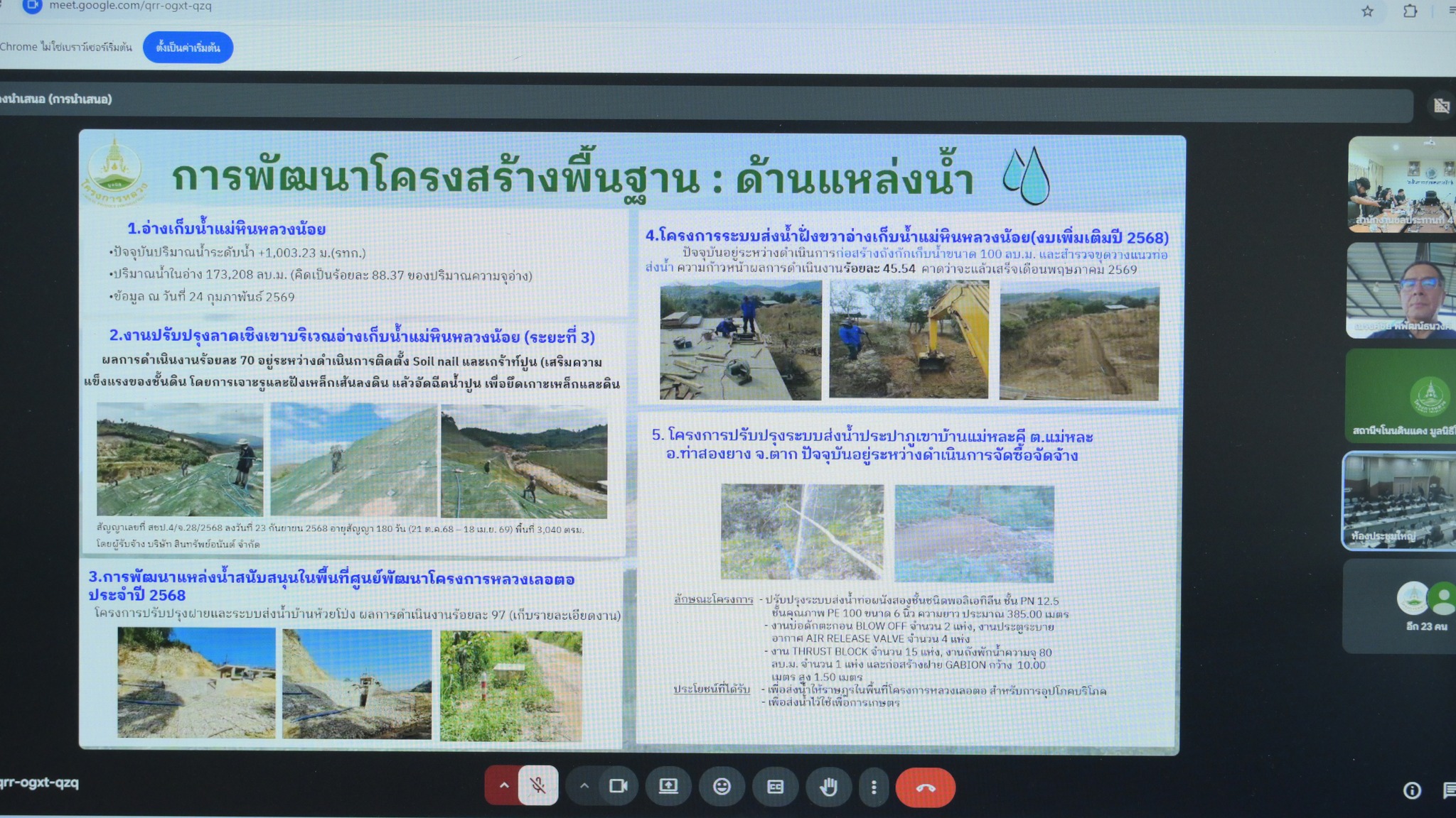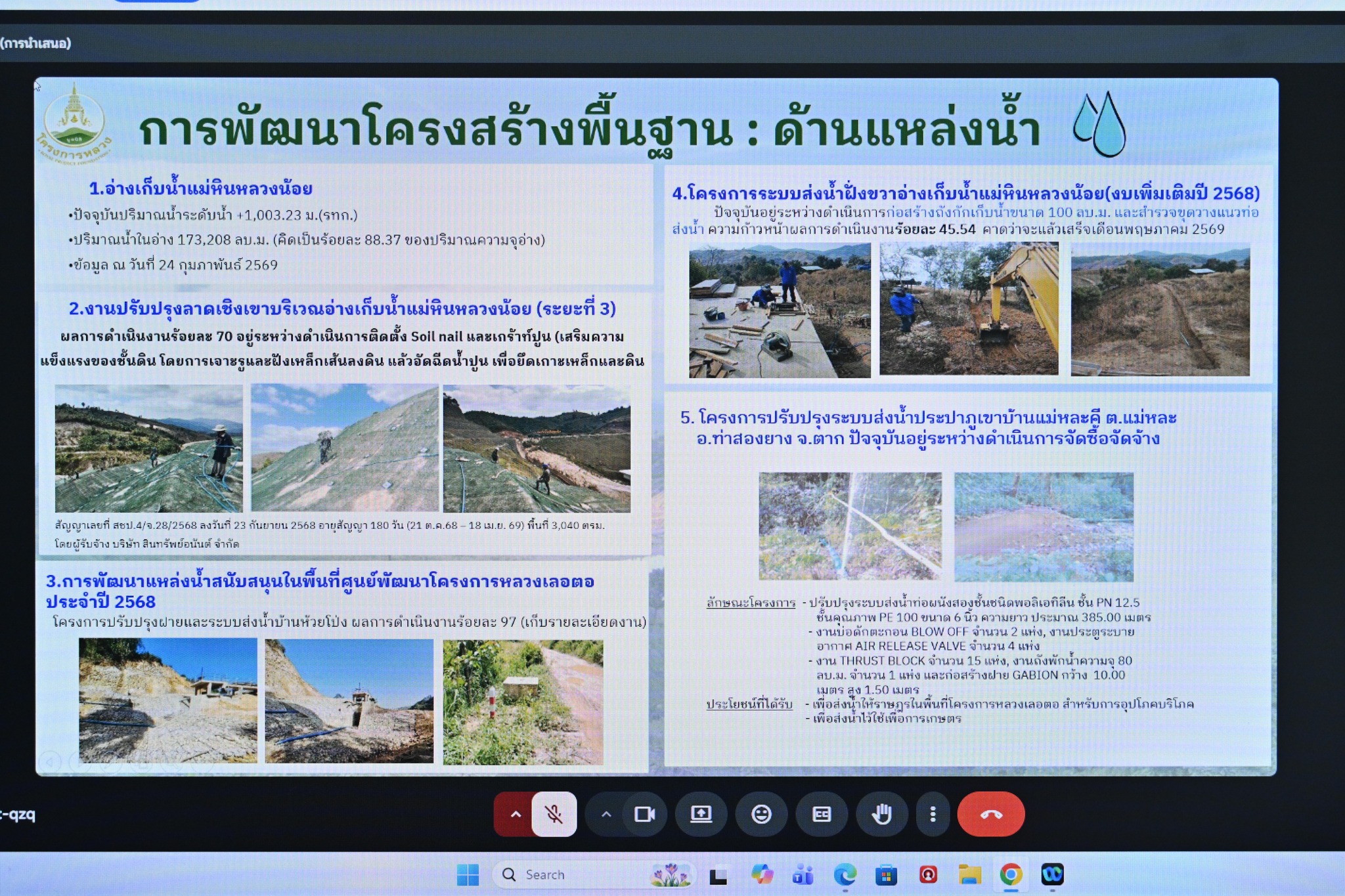 วันที่ 4 มีนาคม 2569 เวลา 09.00 น. นายนครินทร์ วงศ์ฟูเฟื่องขจร ผู้อำนวยการส่วนแผนงาน มอบหมายให้นายศิวกร ปัญญาอ่อง หัวหน้าฝ่ายโครงการพิเศษ และเจ้าหน้าที่ผู้เกี่ยวข้อง เข้าร่วมประชุมและขับเคลื่อนการปฏิบัติตามนโยบาย ผ่านสื่ออิเล็กทรอนิกส์ ณ ห้องประชุมนาคี สำนักงานชลประทานที่ 4 โดยมี พลเอก กัมปนาท รุดดิษฐ์ องคมนตรี ประธานกรรมการบริหารมูลนิธิโครงการหลวง เป็นประธานในการประชุม เพื่อรับทรายแผนการดำเนินงาน และเปลี่ยนความคิดเห็น และร่วมกันพิจารณาแนวทางการดำเนินงานตามนโยบาย แผนงาน และงบประมาณ ให้เป็นไปอย่างมีประสิทธิภาพและสอดคล้องกับแนวทางที่กำหนด