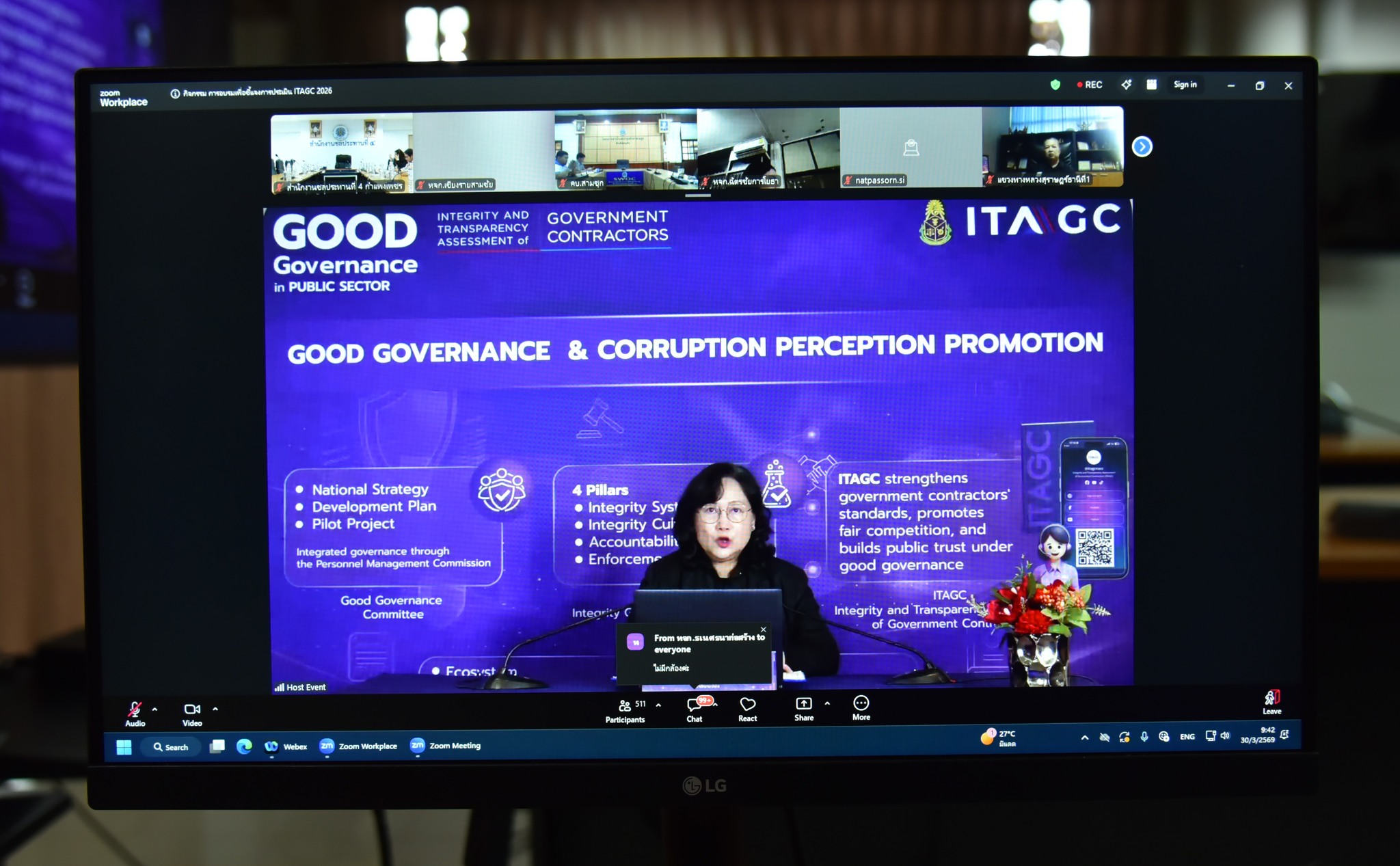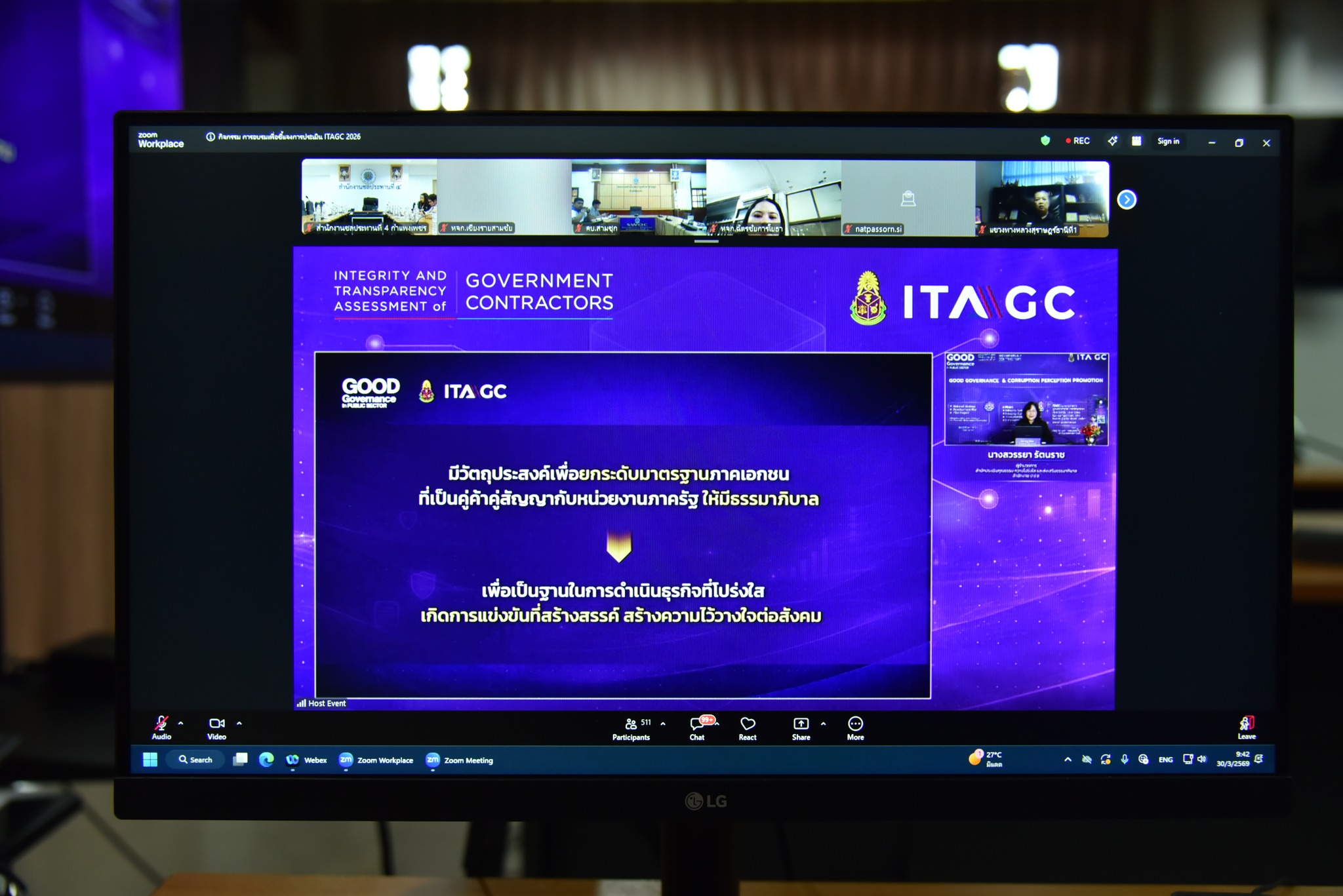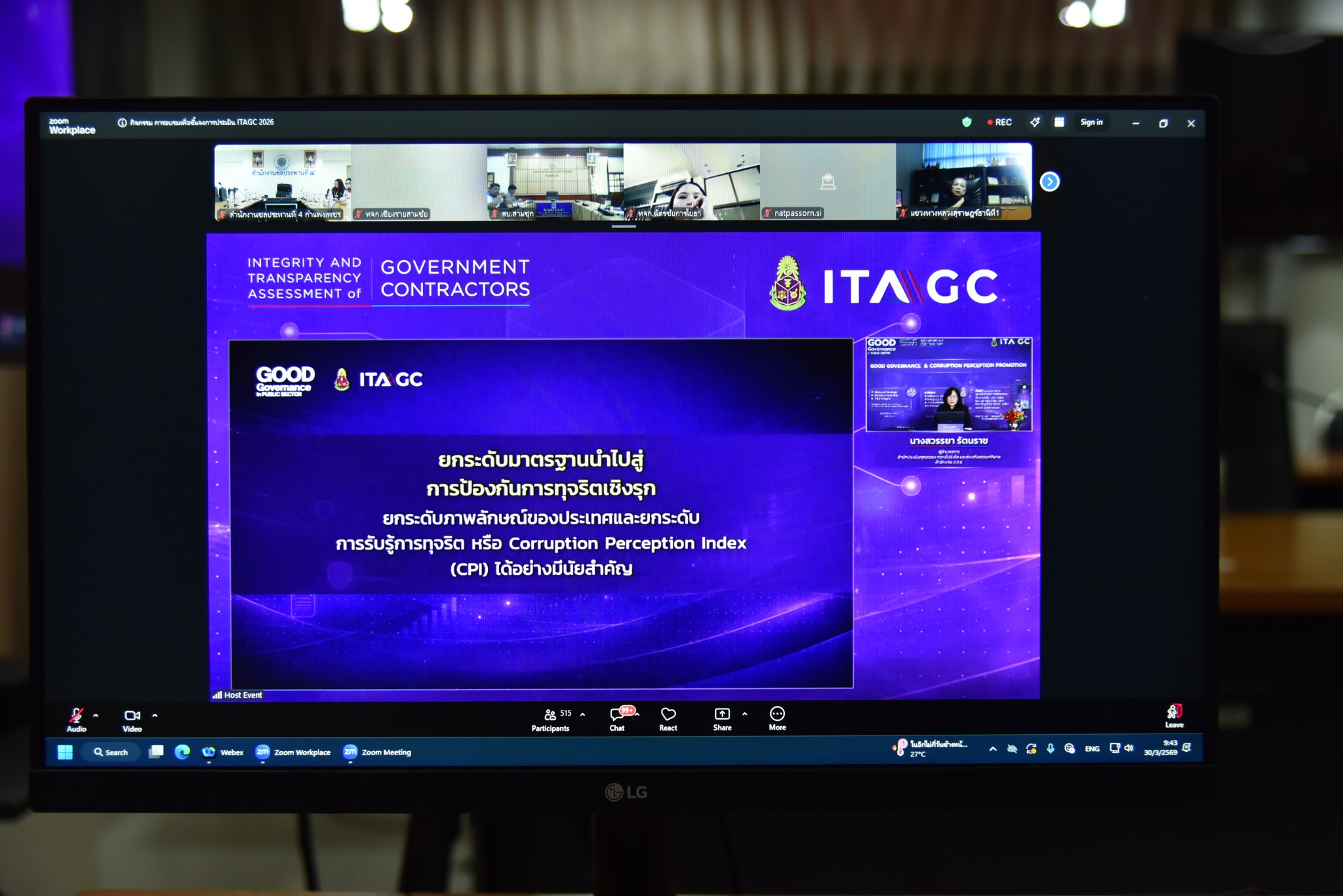 วันที่ 30 มีนาคม 2569 เวลา 09.00 น. นางสาวธิติมา นันตากาศ หัวหน้าฝ่ายพัสดุ และเจ้าหน้าที่ผู้เกี่ยวข้อง เข้าร่วมกิจกรรมการอบรมเพื่อชี้แจงการประเมิน ITAGC 2026 ตามโครงการประเมินคุณธรรมและความโปร่ลใสของหน่วยงานภาคเอกชน (intgriy and Trasparency Assessment of Government Zontractors:ITAGC) ประจำปีงบประมาณ พ.ศ. 2569 ผ่านระบบ Zoom meeting ณ ห้องประชุมนาคา สำนักงานชลประทานที่ 4 โดยมี นางวาธินี สุริยวรรณ ผู้ช่วยเลขาธิการคณะกรรมการ ป.ป.ช. กล่าวเปิดกิจกรรม และนางสวรรยา รัตนราช ผู้อำนวยการสำนักประเมินคุณธรรม ความโปร่งใส และส่งเสริมธรรมมาภิบาล ให้การบรรยาในหัวข้อเรื่อง ทิศทางการพัฒนา ITAGC 2026 โดยการจัดอบรมครั้งนี้ได้ชี้แจงเครื่องมือการประเมิน ITAGC 2026 เป็นโครงการของสำนักงาน ป.ป.ช. ให้ยึดมั่นหลักธรรมมาภิบาล ยกระดับความโปร่งใสในการจัดซื้อจัดจ้าง โดยจะเน้นการประเมินภายนอก (EIT) คู่ค้าที่ทำสัญญา เพื่อให้มั่นใจถึงการดำเนินงานที่ซื่อสัตย์สุจริตตามมาตรการภาครัฐ