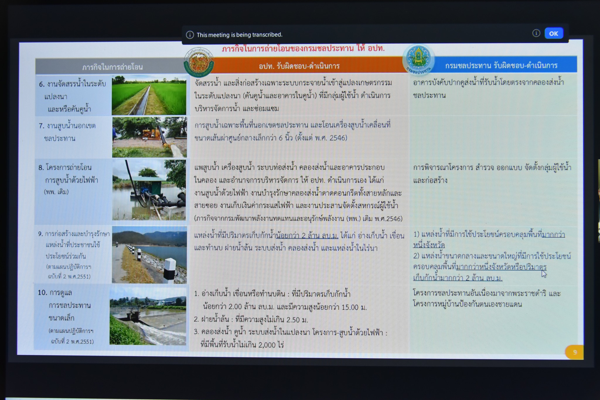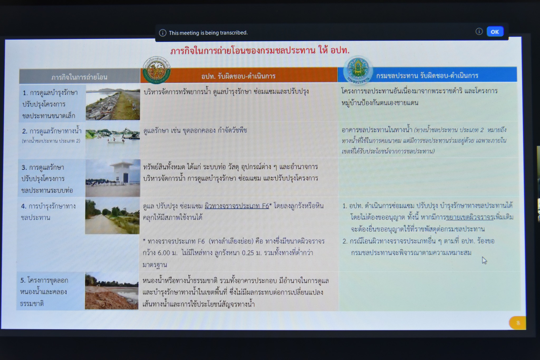 วันที่ 31 มีนาคม 2569 เวลา 13.00 น. นายนครินทร์ วงศ์ฟูเฟื่องขจร ผู้อำนวยการส่วนแผนงาน มอบหมายเจ้าหน้าที่ผู้เกี่ยวข้อง เข้าร่วมประชุมการใช้งานเว็บไซต์ฐานข้อมูลงานถ่ายโอนภารกิจให้แก่องค์กรปกครองส่วนท้องถิ่น (อปท.) ของกรมชลประทาน โดยมี นายธเนศร์ สมบูรณ์ ผู้อำนวยการสำนักบริหารจัดการน้ำและอุทกวิทยา กรมชลประทาน เป็นประธานการประชุม ผ่านระบบ Zoom meeting ณ ห้องประชุมศูนย์ปฏิบัติการน้ำอัจฉริยะ ชั้น 3 อาคาร 99 ปี หม่อมหลวงชูชาติ กำภู กรมชลประทาน สามเสน มายัง ณ ห้องประชุมนาคี สำนักงานชลประทานที่ 4 เพื่อรับฟังคำชี้แจงภาพรวมการถ่ายโอนภารกิจให้แก่องค์กรปกครองส่วนท้องถิ่นของกรมชลประทาน และการแนะนำเว็บไซต์ฐานข้อมูลงานถ่ายโอนภารกิจแก่องค์กรปกครองส่วนท้องถิ่น พร้อมสาธิตการใช้งานผ่านเว็บไซต์ เพื่อใช้เป็นเครื่องมือในการรวบรวมข้อมูลและติดตามการดำเนินงานการถ่ายโอนย้ายภารกิจให้เป็นไปอย่างมีประสิทธิภาพและเป็นไปในทิศทางเดียวกัน
