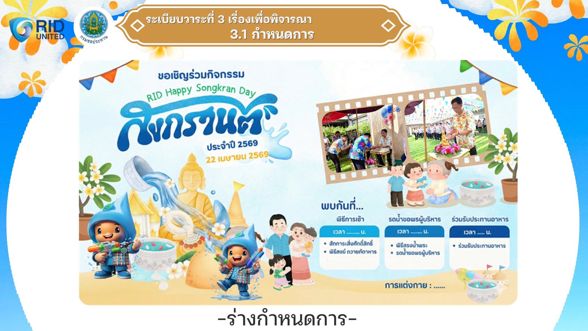 วันที่ 7 เมษายน 2569 เวลา 13.30 น. นายบำรุง นิยมธรรมนิตย์ ผู้อำนวยการส่วนบริหารทั่วไป นายนครินทร์ วงศ์ฟูเฟื่องขจร ผู้อำนวยการส่วนแผนงาน นายทนงศักดิ์ อะโน ผู้อำนวยการส่วนวิศวกรรม นายอภินันทร์ จ่าพันดุง ผู้อำนวยการส่วนบริหารจัดการน้ำและบำรุงรักษา และเจ้าหน้าที่ผู้เกี่ยวข้อง เข้าร่วมประชุมเตรียมความพร้อมจัดงานสงกรานต์สืบสานประเพณีไทย ประจำปี 2569 สำนักงานชลประทานที่ 4 ณ ห้องประชุมนาคา สำนักงานชลประทานที่ 4 เพื่อร่วมหารือกำหนดการการจัดงานสงกรานต์ของสำนักงานชลประทานที่ 4 โดยมีพิธีสักการะสิ่งศักดิ์สิทธิ์ประจำสำนักงานฯ พิธีสรงน้ำพระ พิธีรดน้ำขอพรผู้บริหาร และกิจกรรมอื่นๆ เพื่อให้การจัดงานเป็นไปด้วยความเรียบร้อย และเป็นการสืบสานขนบธรรมเนียม ประเพณี วัฒนธรรม ที่ดีงามให้คงอยู่สืบต่อไป